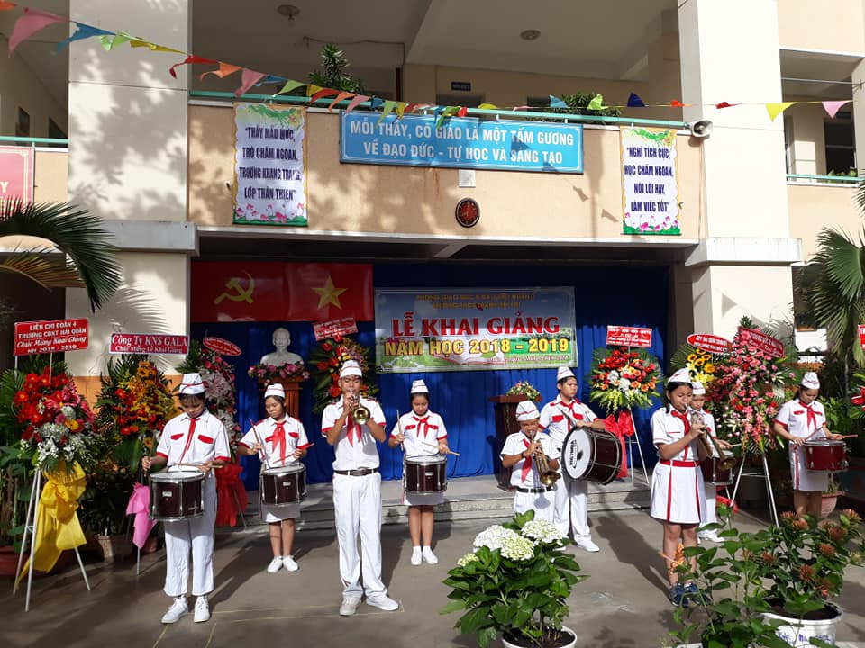Cô Đinh Kim Quy – Hiệu trưởng nhà trường đọc diễn văn khai giảng và đánh tiếng trống khai trường năm học mới.
